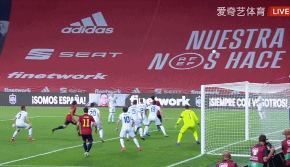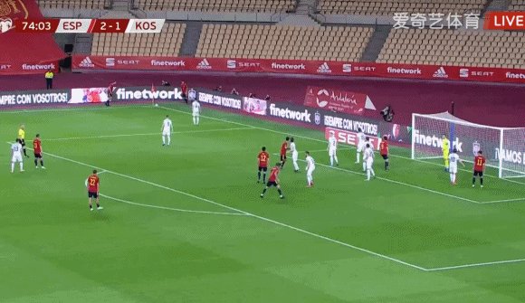 75'西班牙左侧角球,赫拉德·莫雷诺力压穆里奇头球破门,3比1!